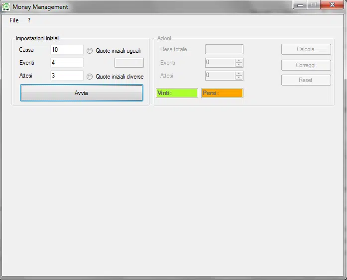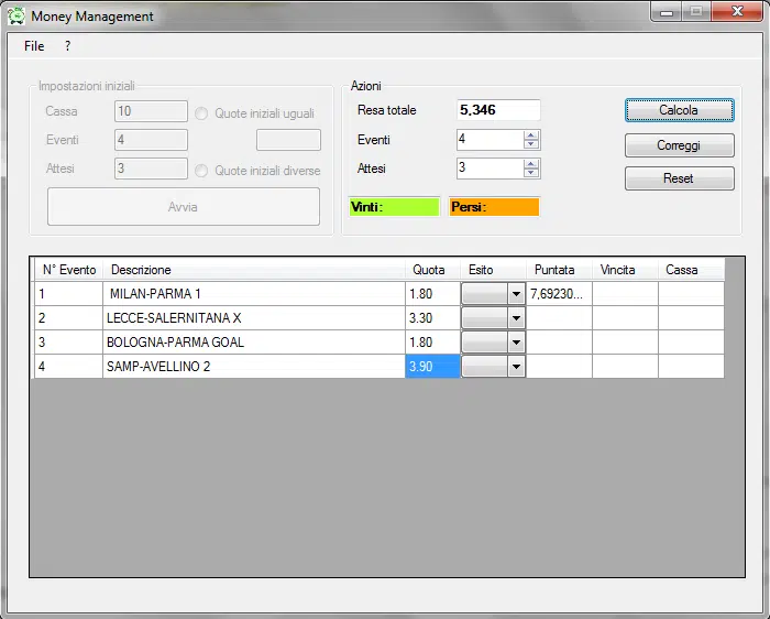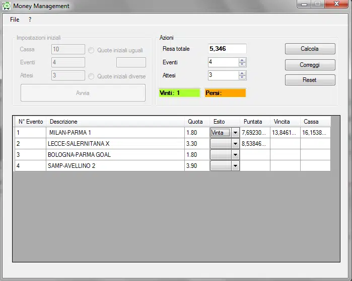 Impostata la cassa, configurate il numero di eventi e di questi quelli attesi, ovvero quelli che pensate di indovinare con i pronostici. Si tratta dunque di stabilire il margine di errore dal quale si svilupperà la progressione.