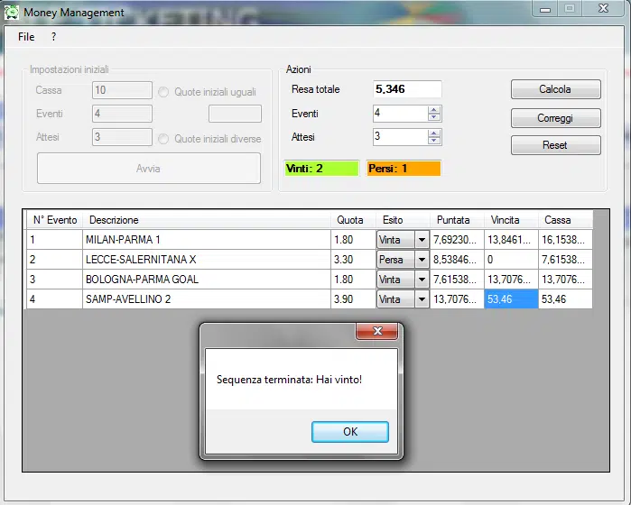 Una volta conclusa la prima gara, bisognerà specificarne l’esito tra vinta o persa in base al pronostico. In base all’esito il software si occuperà di calcolare l’importo per la seconda scommessa.